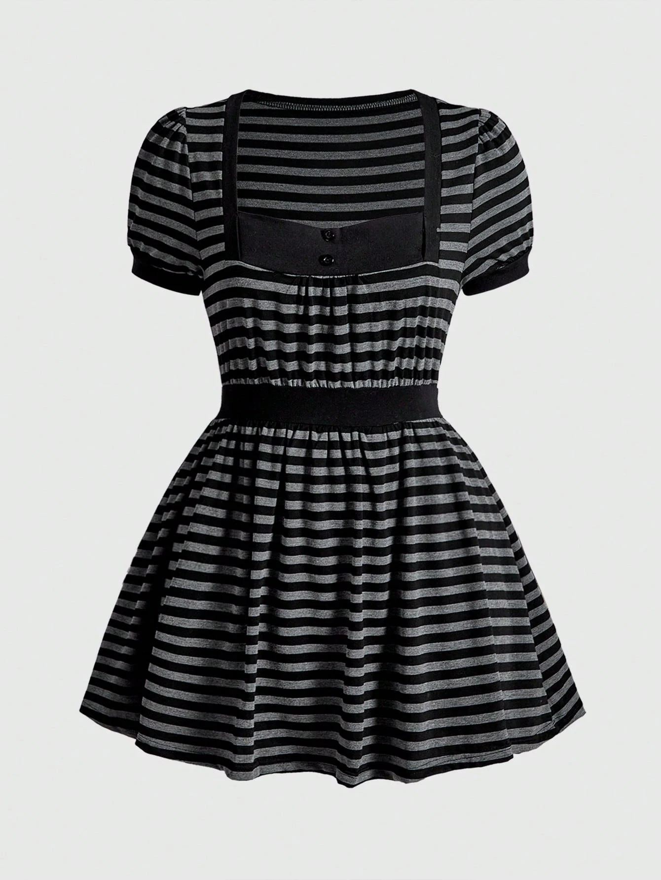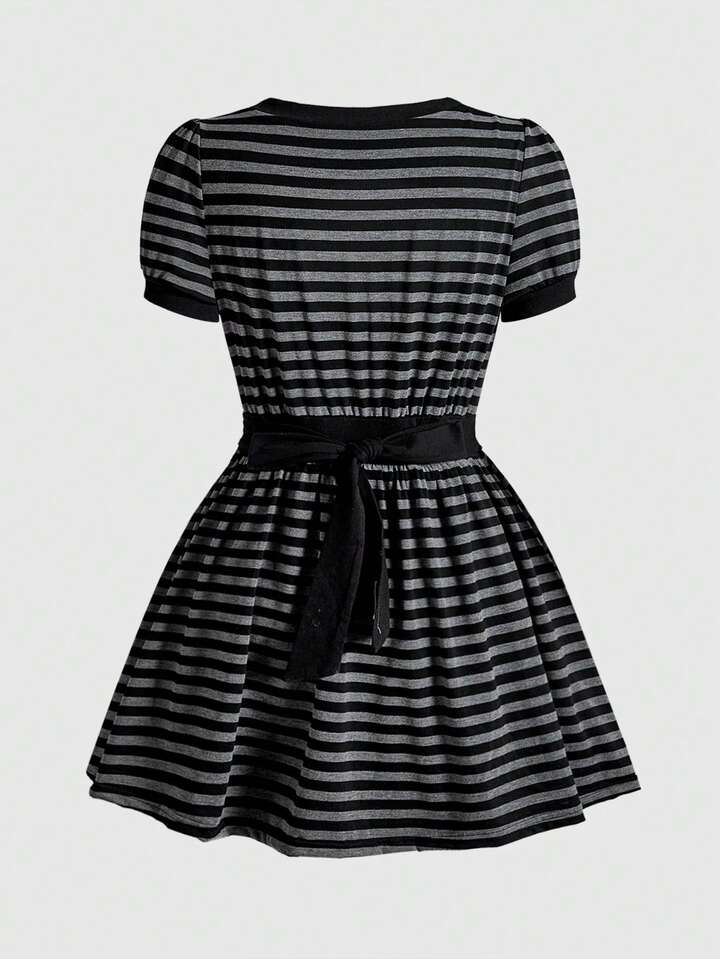Kawaii Robe mini style collège à manches bouffantes rayées en forme de ligne A