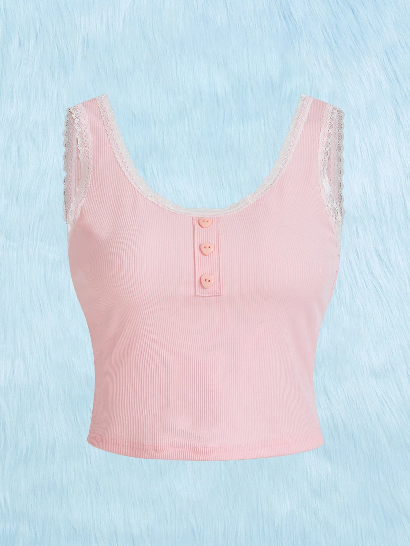 Kawaii Débardeurs et camisoles pour femmes Boutons Dentelle contrastée Tissu côtelé Casual Unicolore