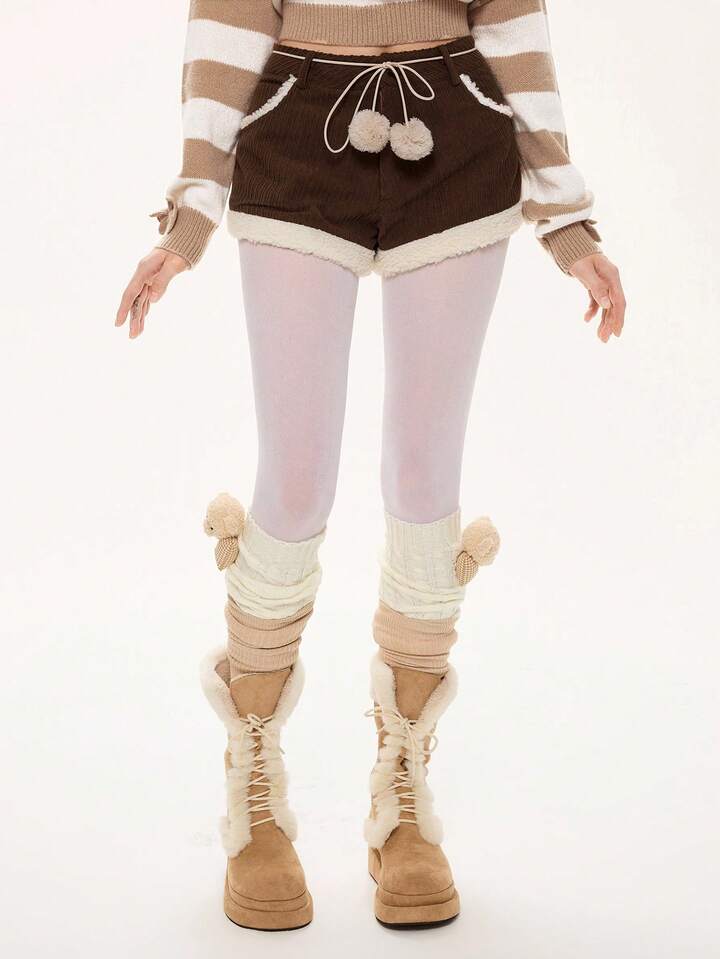 Kawaii Short en fausse fourrure marron mignon et patchwork pour femmes