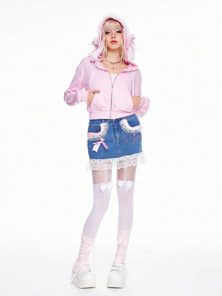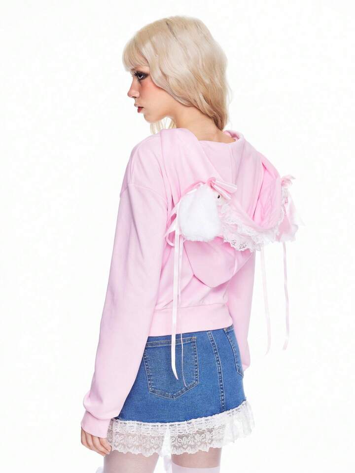 Kawaii sweat-shirt à capuche court décoré d'un nœud en dentelle minimaliste et mignon pour femmes