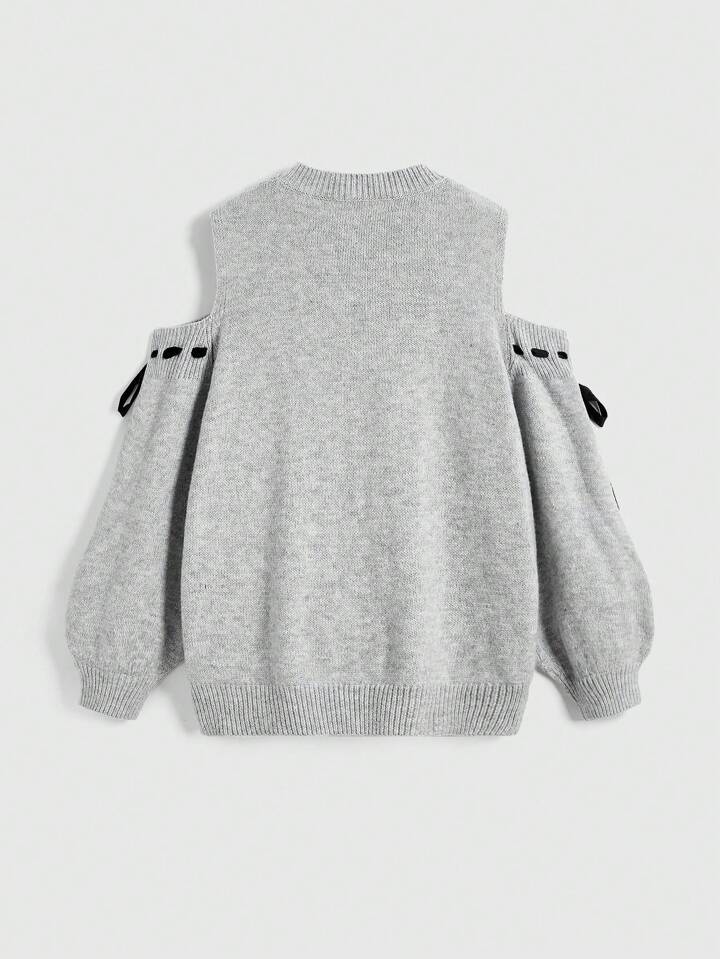 Kawaii Mignon pull oversize type "himekaji" avec épaules dénudées et nœud décoratif sur la manche, décontracté pour les adolescentes