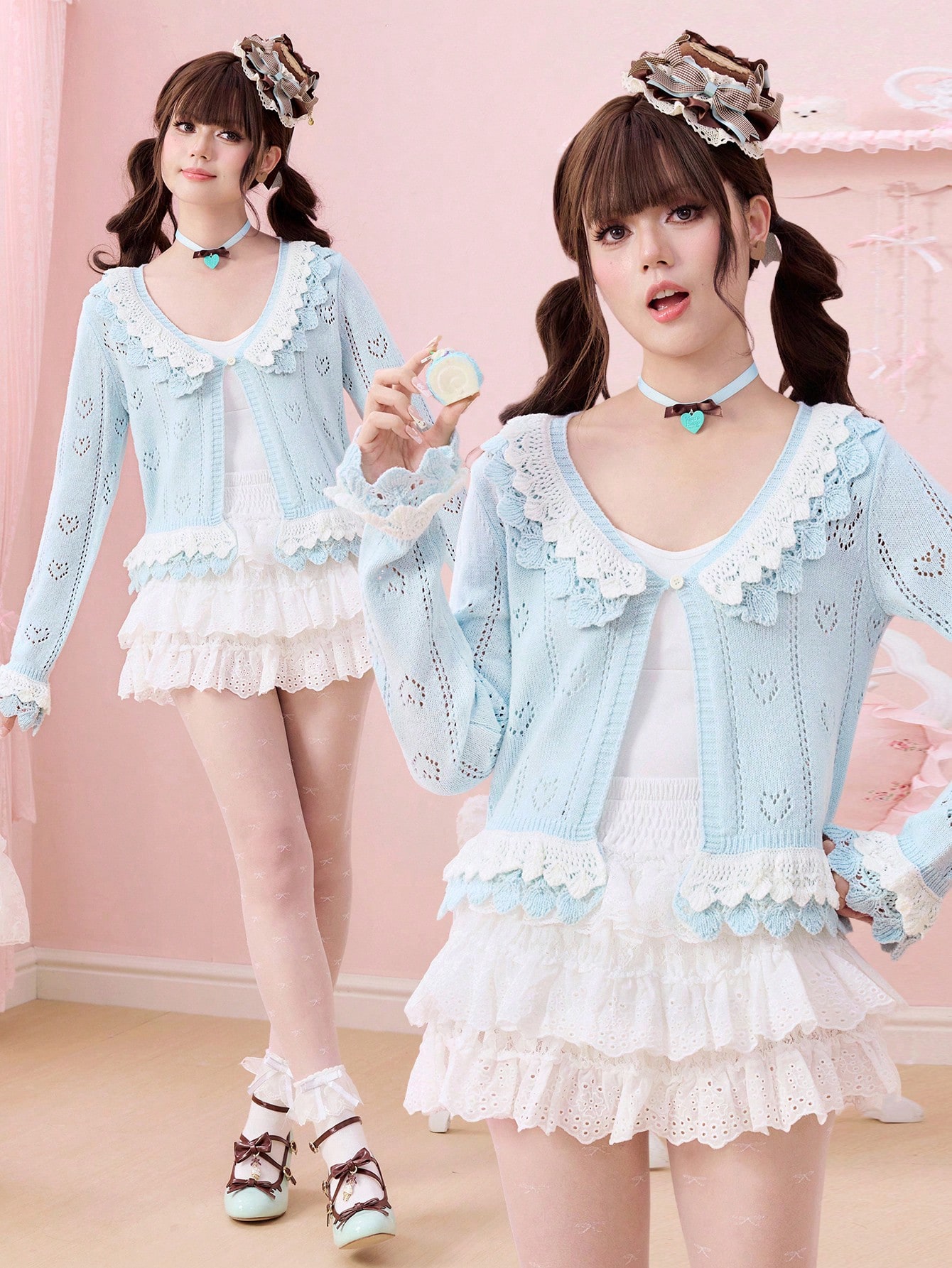 Kawaii Cardigan mignon à double couche avec volants, motifs cœur et papillon ajourés pour femmes