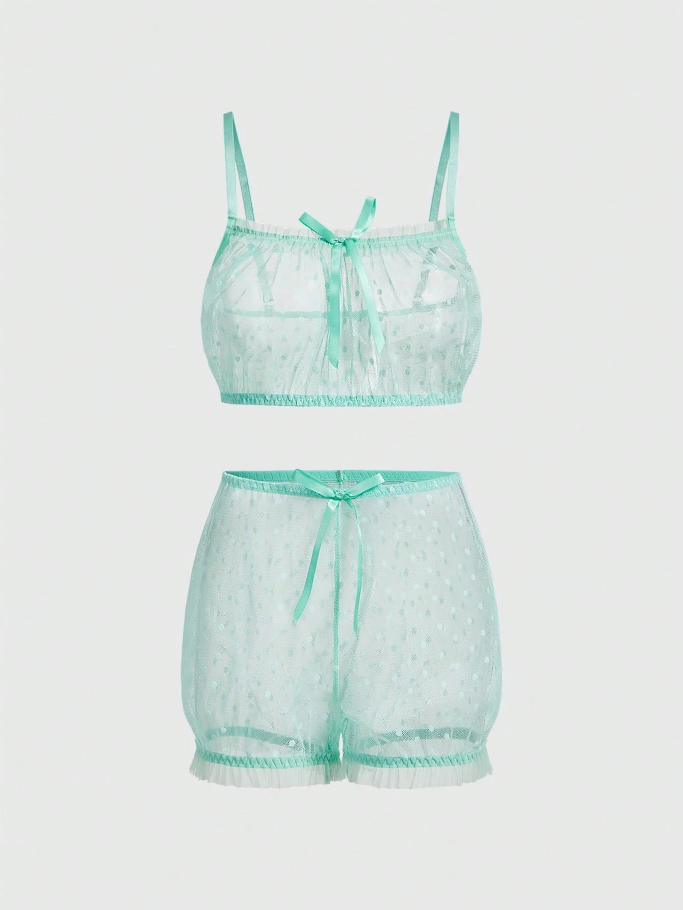Kawaii Ensemble de lingerie mignon et sexy en tissu jacquard à pois, composé d'un débardeur et d'un short