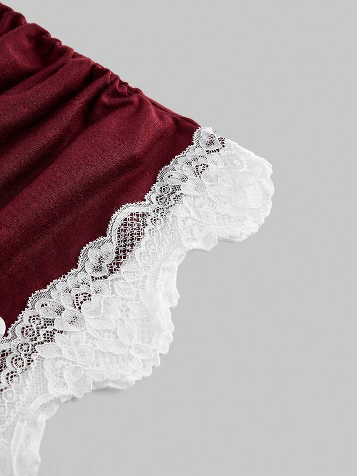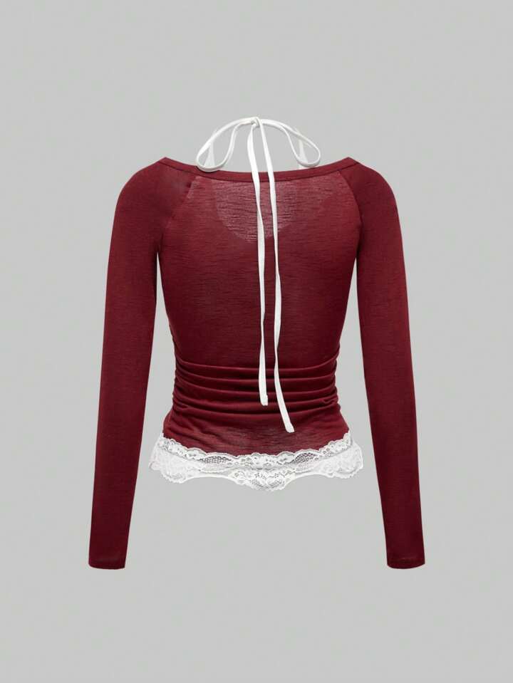 Kawaii Joli et doux T-shirt moulant pour femmes avec col froncé, bordure en dentelle contrastée et côtes profondes gris