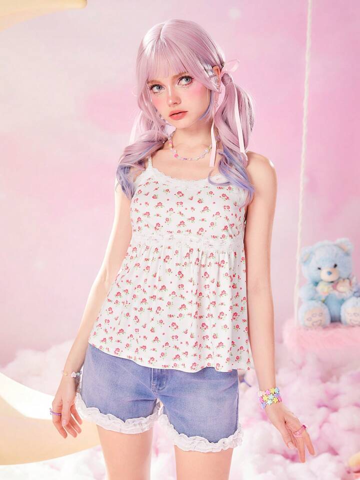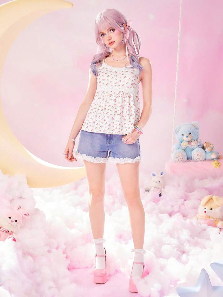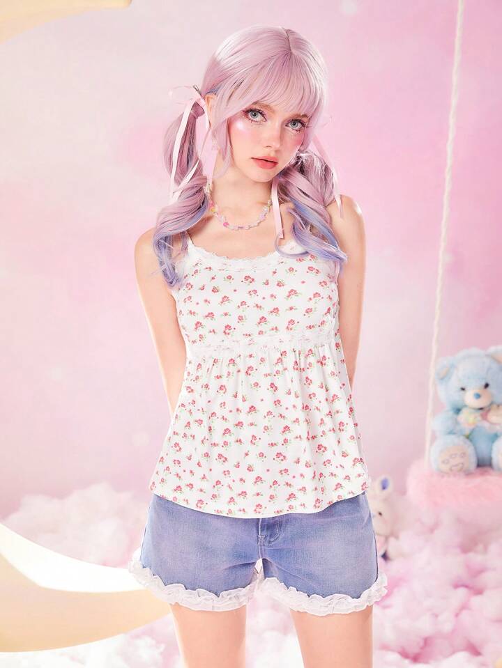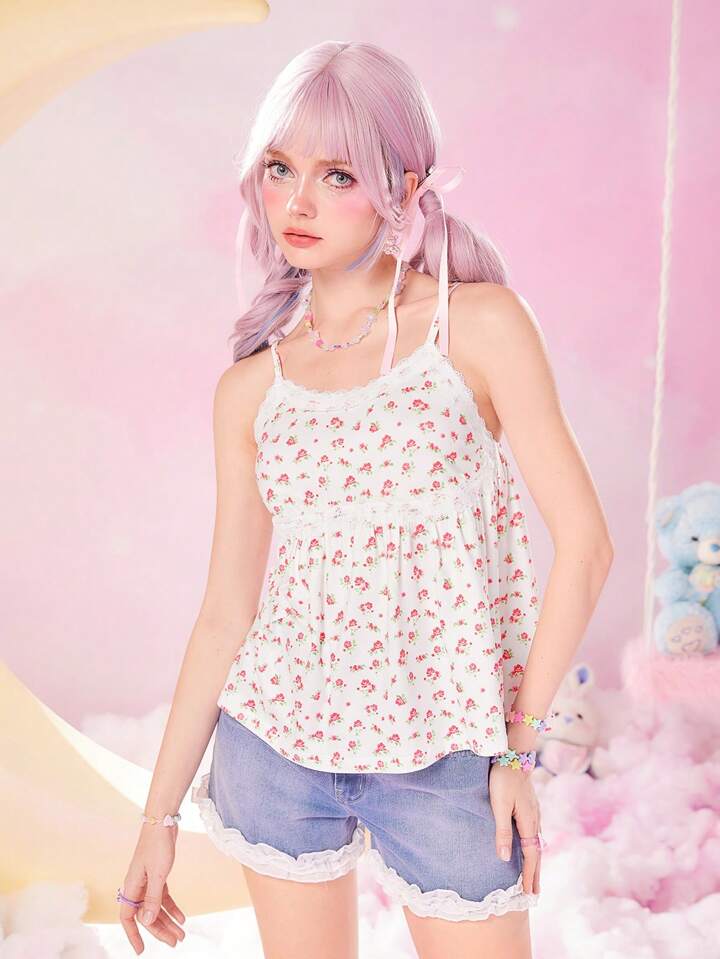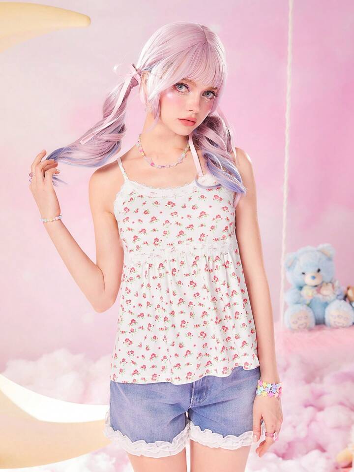 Kawaii Top À Fines Brides Imprimé Floral En Dentelle