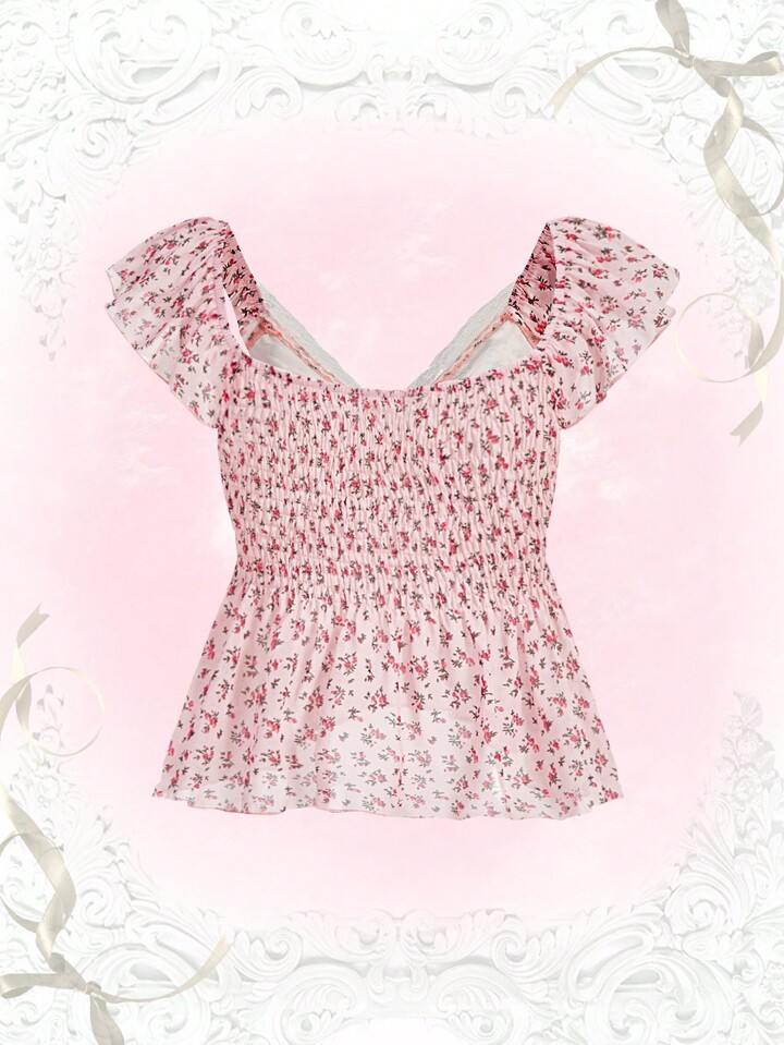 Kawaii Blouse Péplum Imprimé Floral En Dentelle