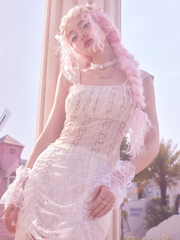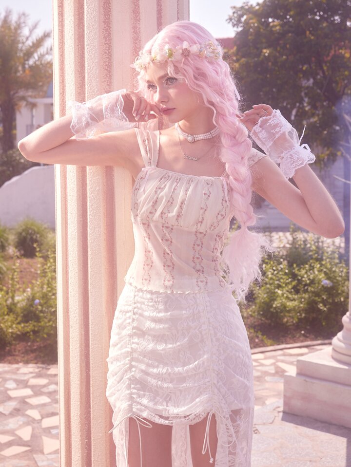 Kawaii Top à fines brides fleuri à ruchés en dentelle
