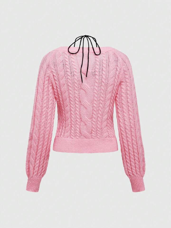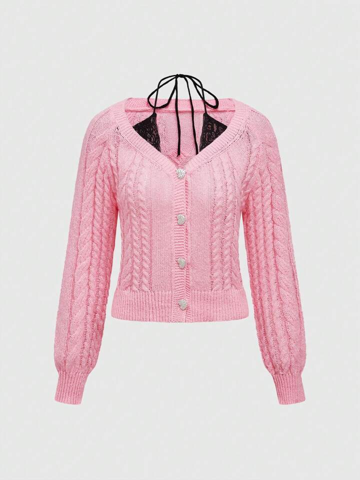 Kawaii Cardigan fin à lacets avec boutons en strass en forme de cœur