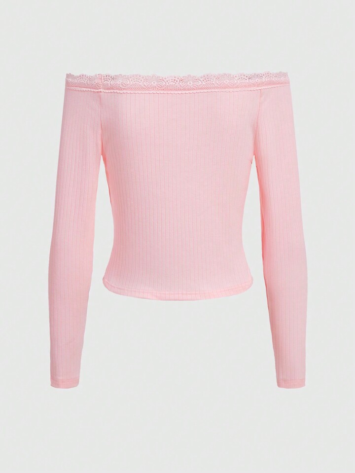 Kawaii T-shirt Col Bardot Ourlet En Dentelle À Strass Motif Papillon