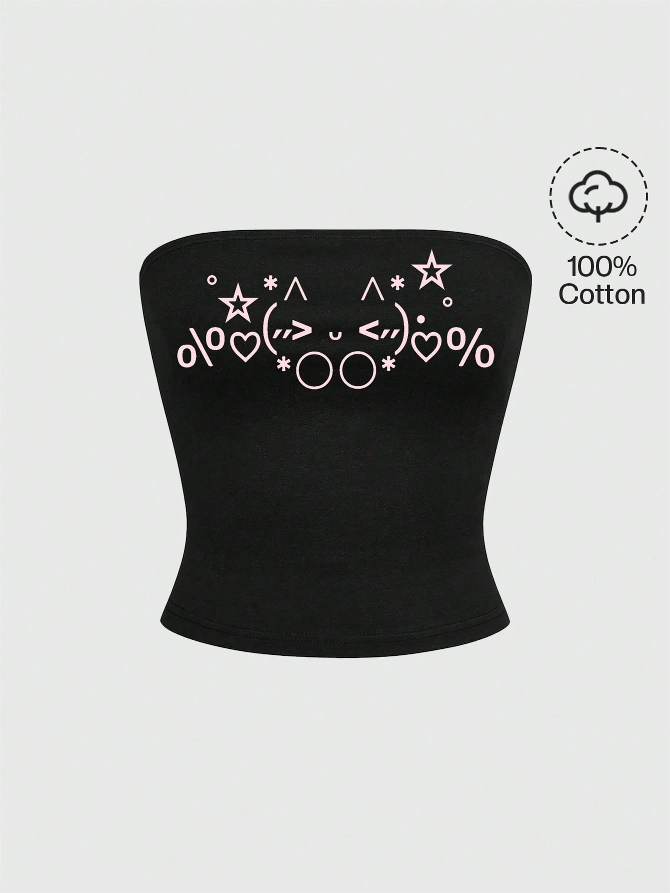 Kawaii Débardeur noir en coton grande taille pour femmes avec imprimé visage émoticon rose en forme de cœur rougissant