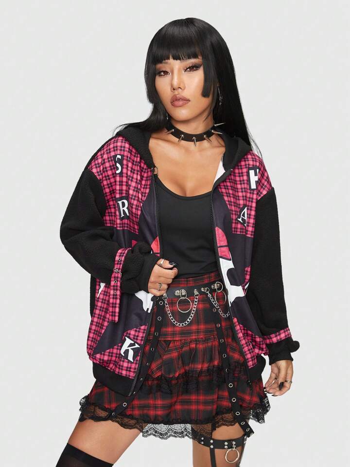 Kawaii Veste À Carreaux Motif Tête De Mort Épaule tombante À Capuche