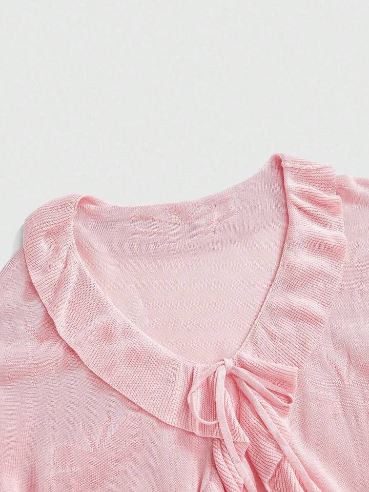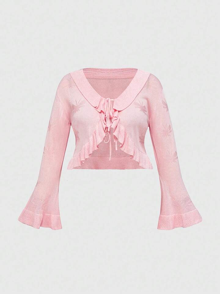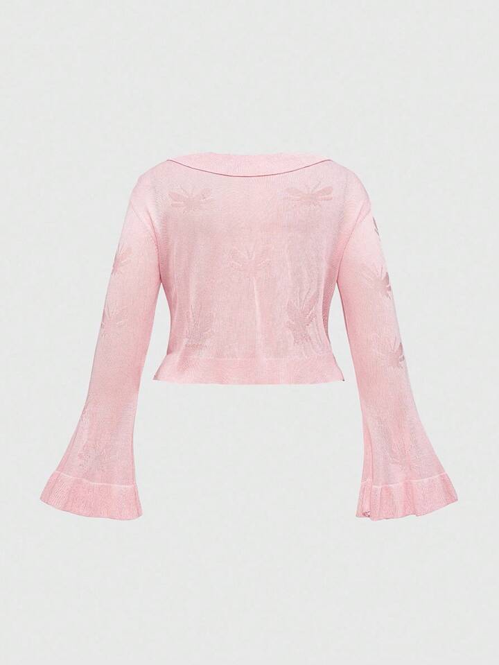 Kawaii Cardigan court en tricot à manches évasées, ourlet volant et motif papillon, taille grande