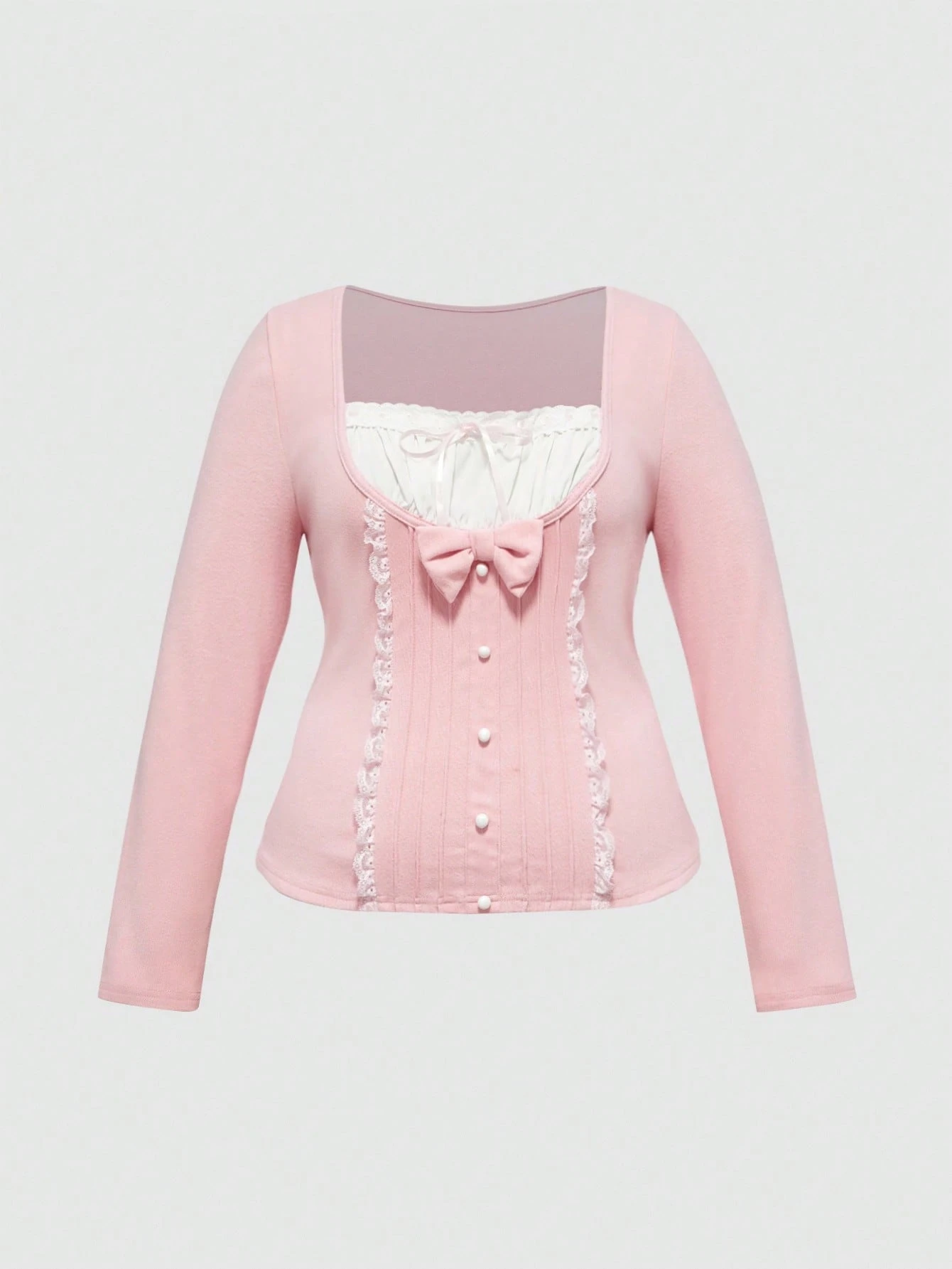 Kawaii T-shirt à manches longues 2 en 1 avec décoration nœud mignon pour femmes grande taille