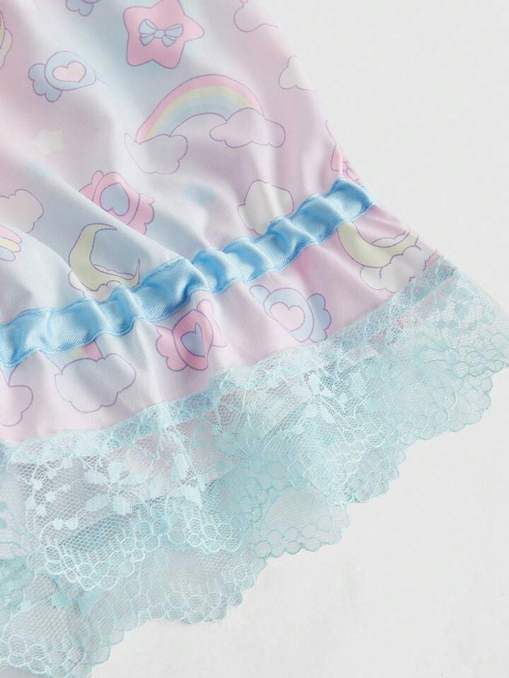 Kawaii Shorts d'été grande taille à patchwork de dentelle imprimé de bonbons arc-en-ciel.