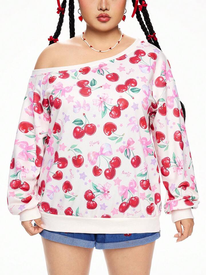 Kawaii Sweat-shirt d'épaule oblique avec imprimé de nœud et fleurs de cerisier pour grande taille, printemps