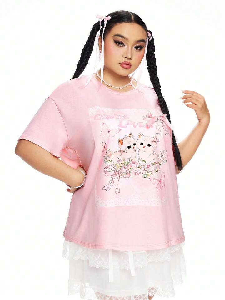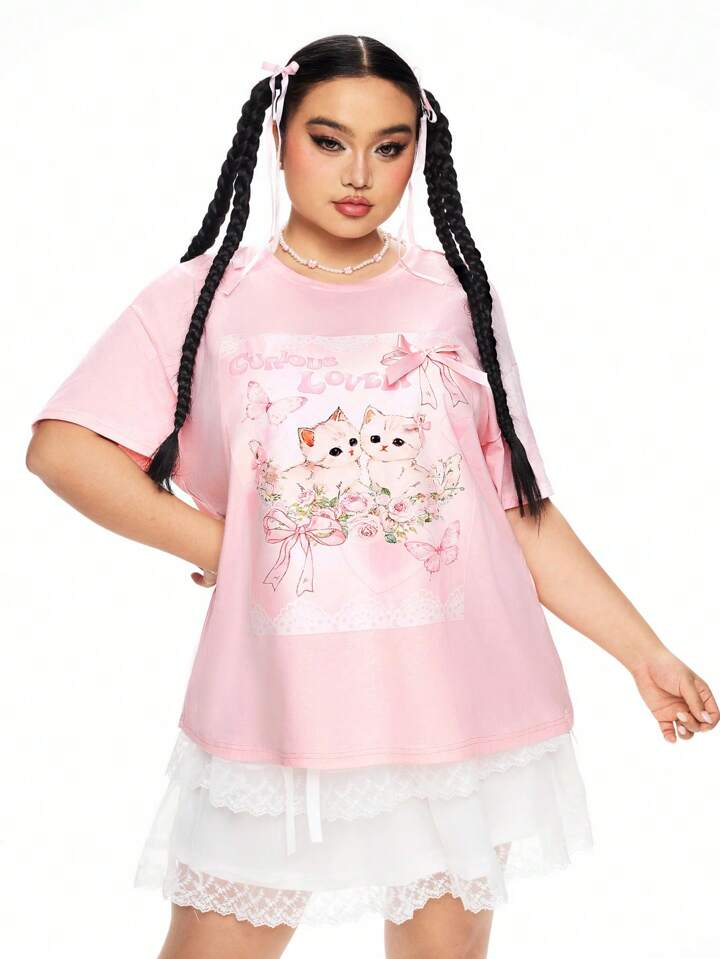 Kawaii T-shirt oversize pour femmes avec imprimé mignon chat 3D et nœud papillon