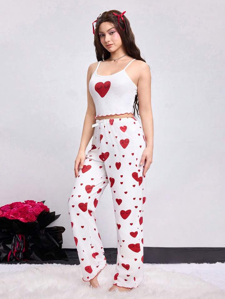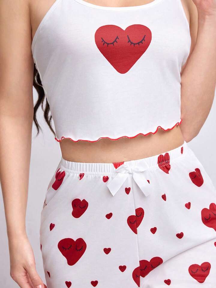Kawaii Ensemble de pyjama décontracté composé d'un débardeur et d'un short imprimé de cœurs romantiques pour la Saint-Valentin