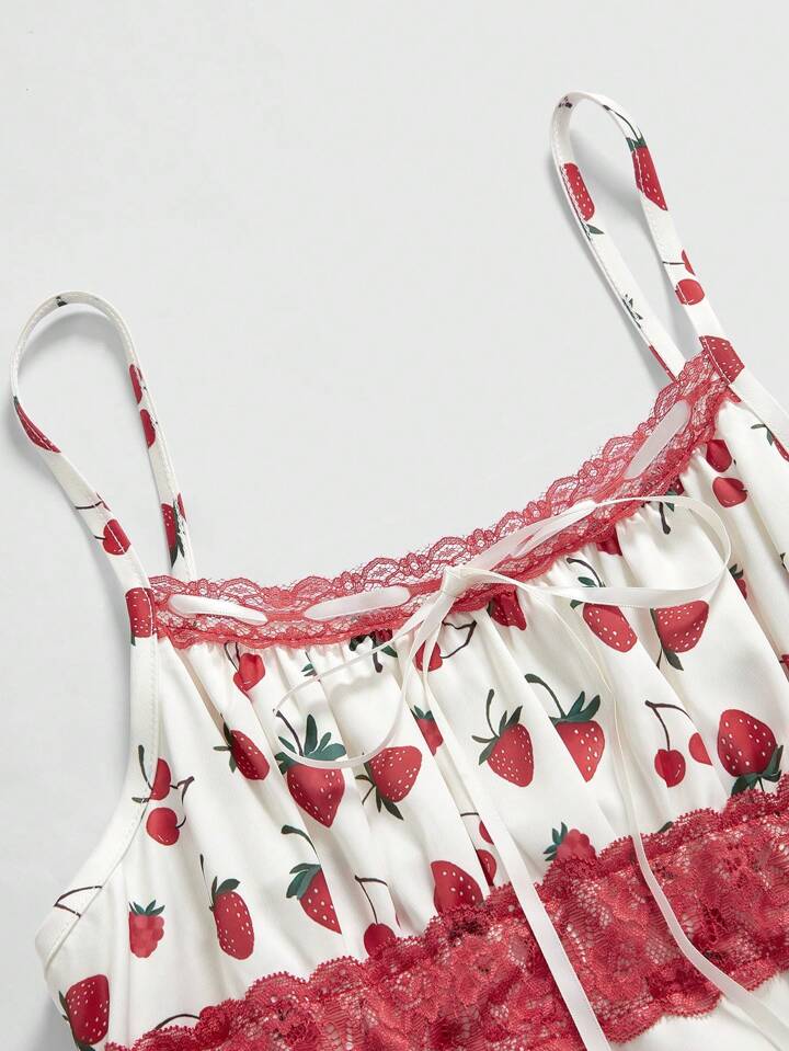 Kawaii Robe courte femme à imprimé fraise et cerise avec dentelle contrastée