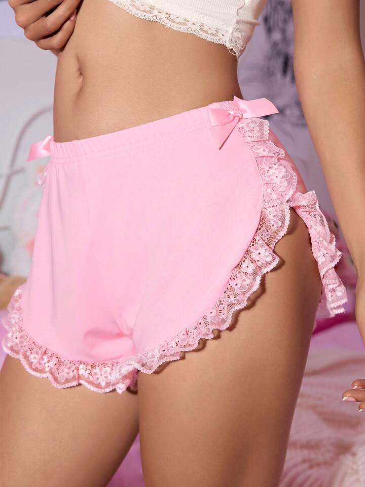 Short décontracté et confortable pour la maison avec motif cœur kawaii, patchwork de dentelle et décoration de nœud