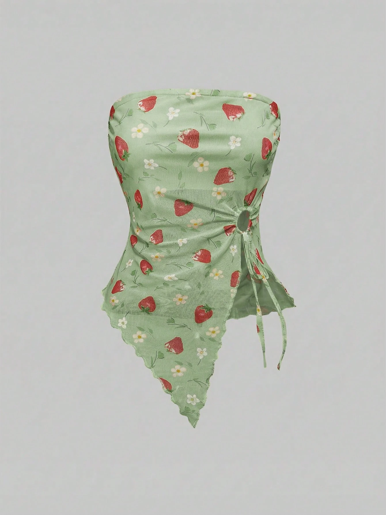 Kawaii Top tube à ourlet asymétrique imprimé fraise d'été, blouse en tissu de maille style Y2K