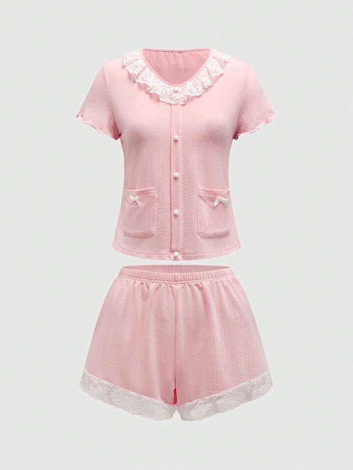 Kawaii Ensemble de pyjama à manches courtes confortable et doux avec patchwork de rayures cahoteuses et dentelle