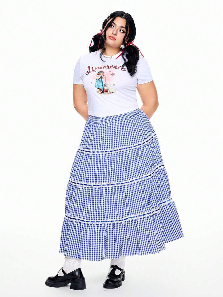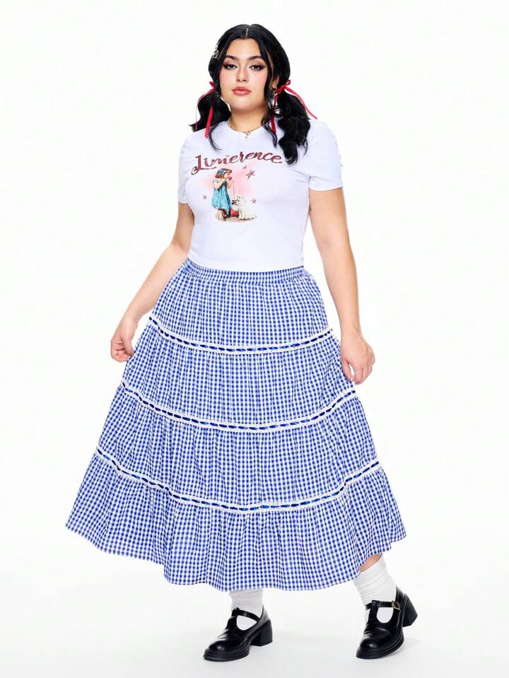 Kawaii Jupe évasée à volants multicouches à ruban et carreaux en grande taille, tenue de vacances pour femme