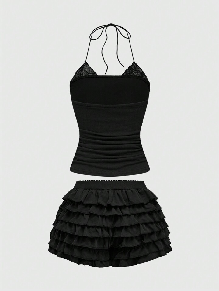 Kawaii Ensemble 2 pièces pour femmes : Débardeur à bretelles en dentelle et jupe à volants