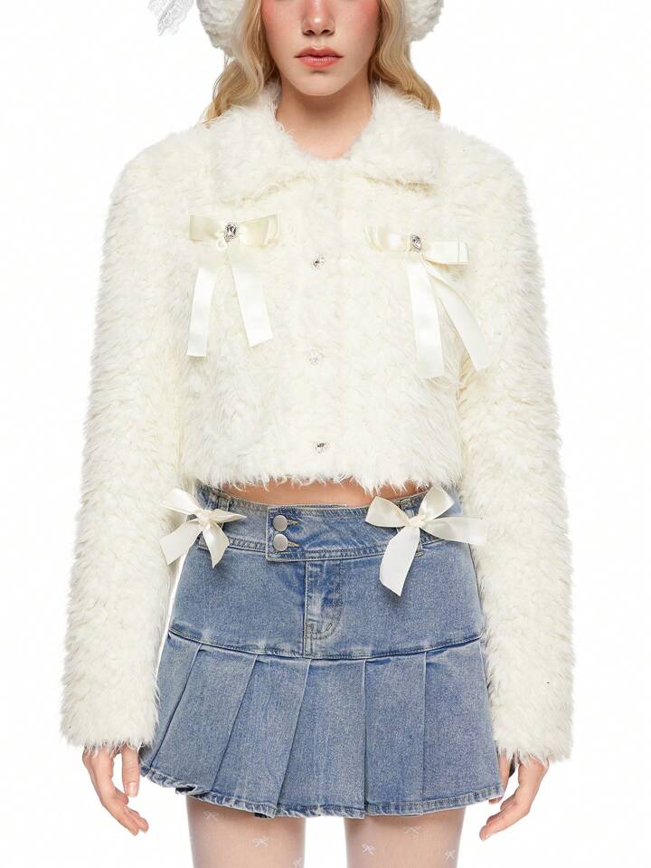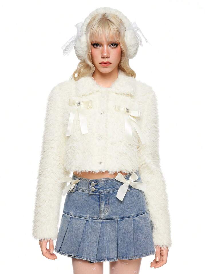 Kawaii Veste courte mignonne avec décor nœud duveteux pour femmes, idéale pour l'hiver