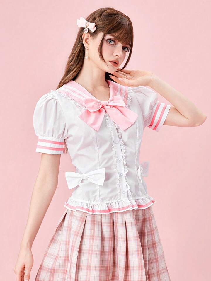 Kawaii Blouse à col marin nœud papillon, volant à l'ourlet, style universitaire, pour école