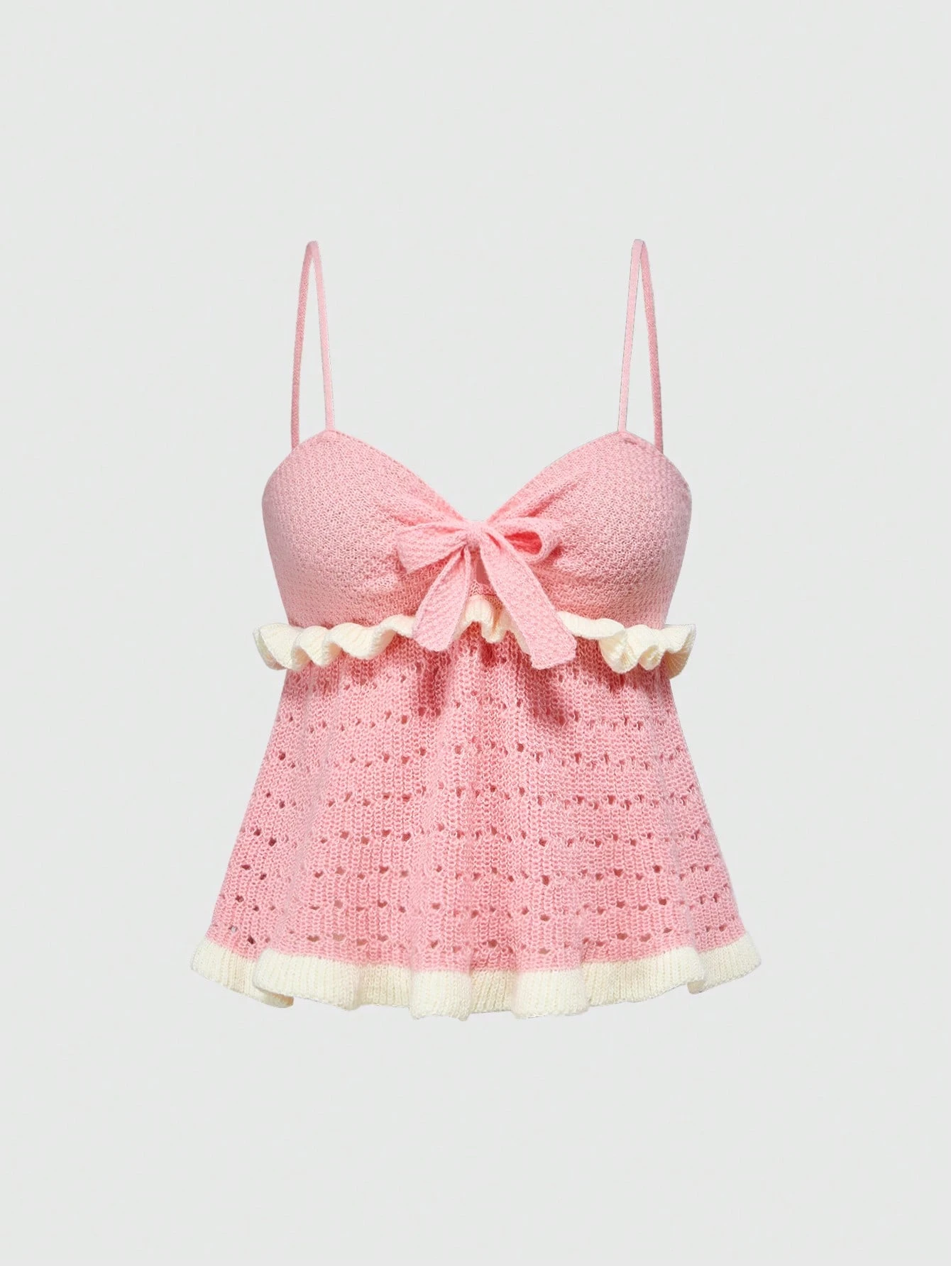 Kawaii Débardeur en tricot avec nœud décoratif et volants de couleur contrastée pour femmes