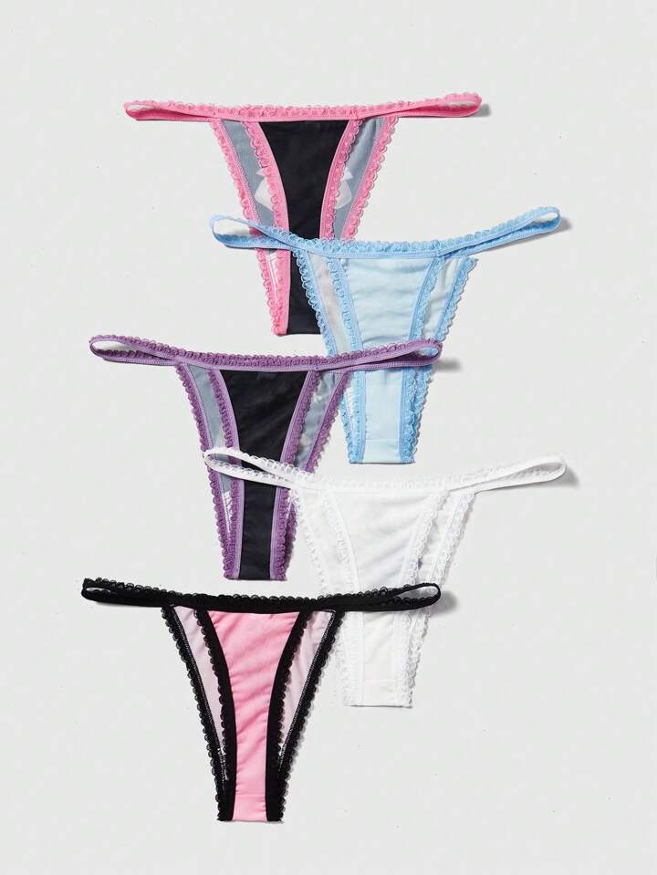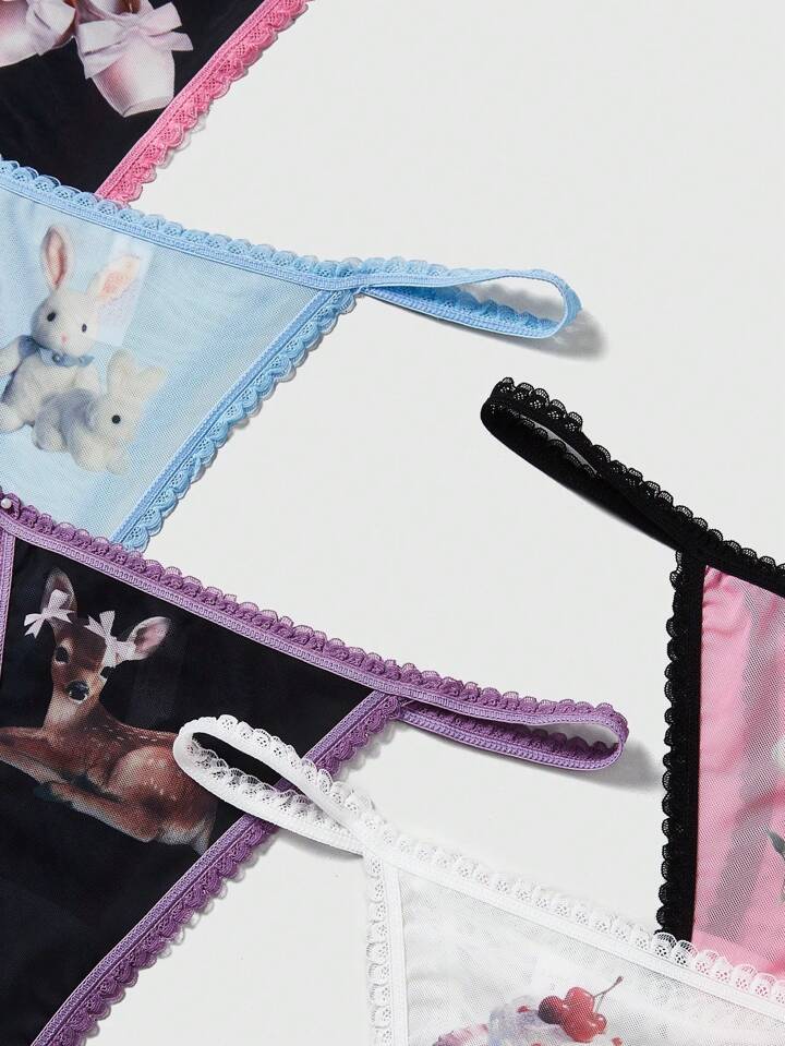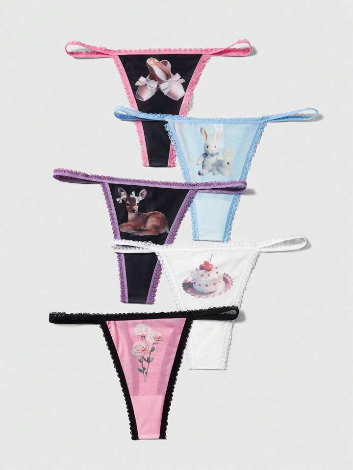Kawaii String Imprimé De Dessin Animé Pour Femme Avec Garniture De Dentelle, 5 Pièces / Paquet