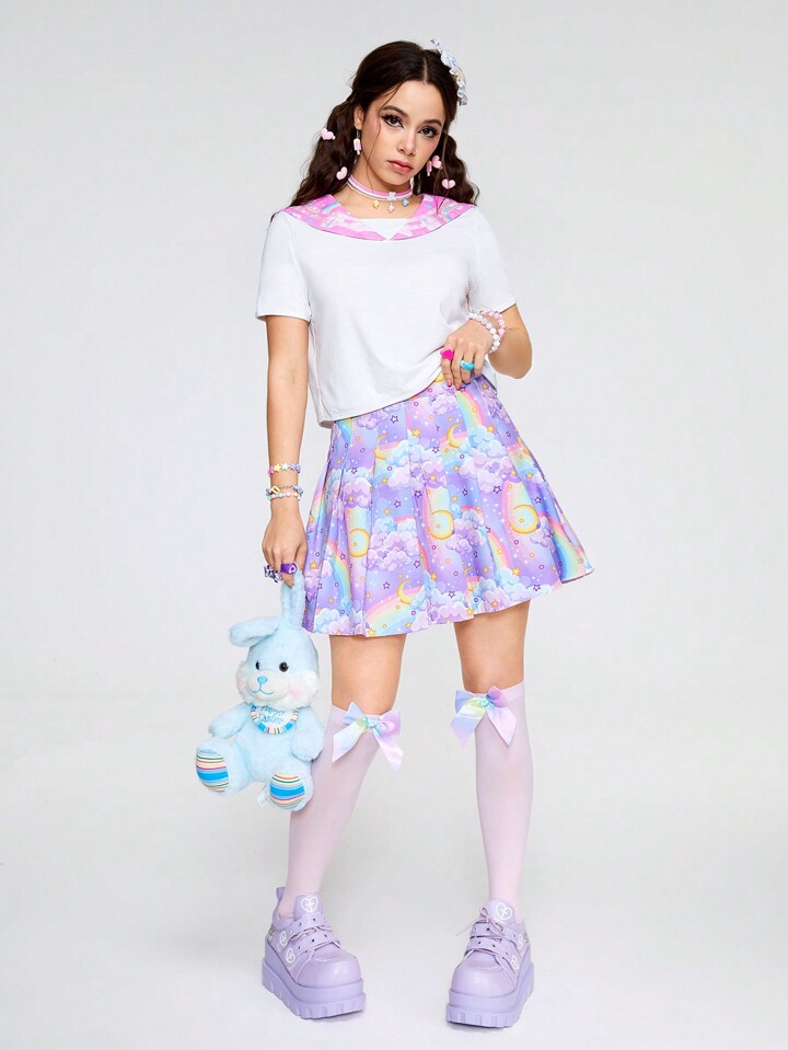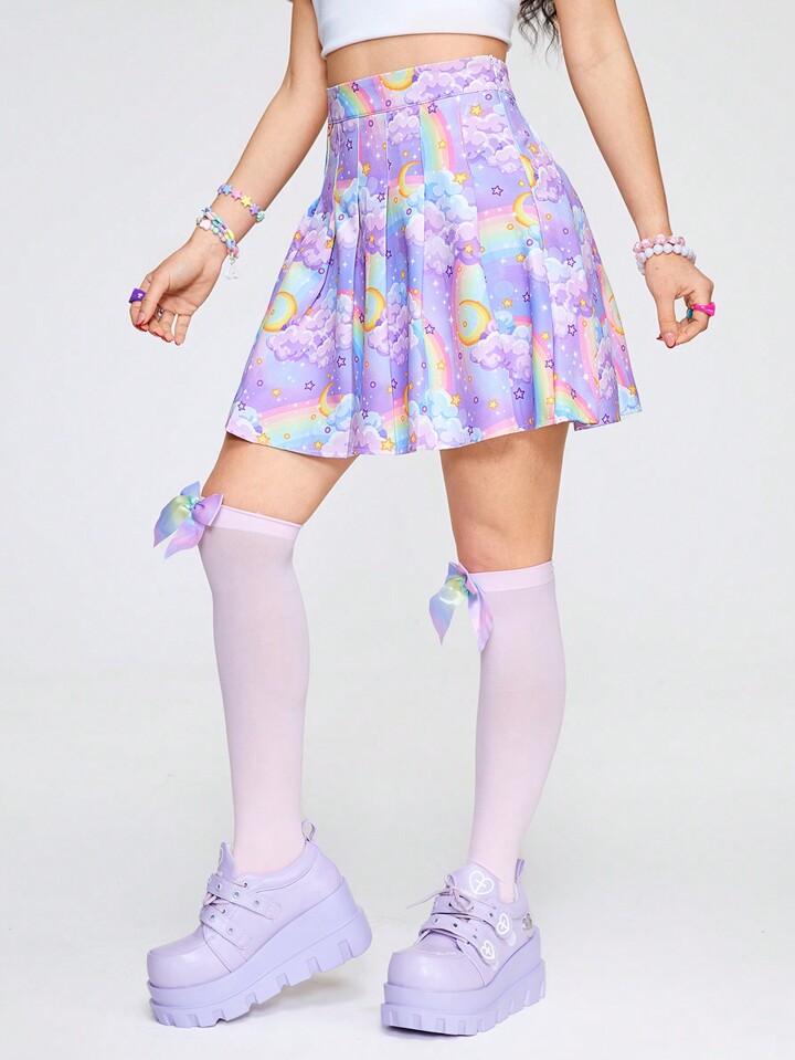 Kawaii Jupe Courte Plissée Imprimée Arc-en-ciel Pour Femmes
