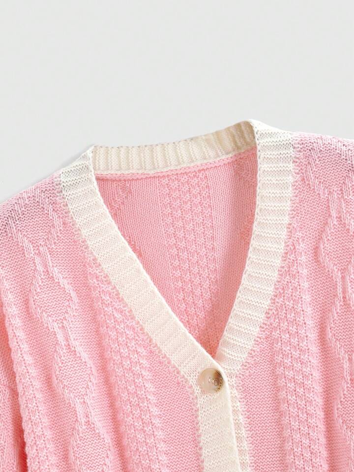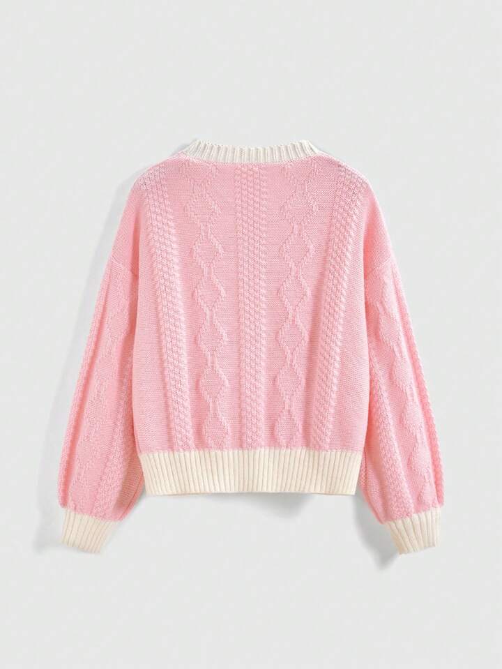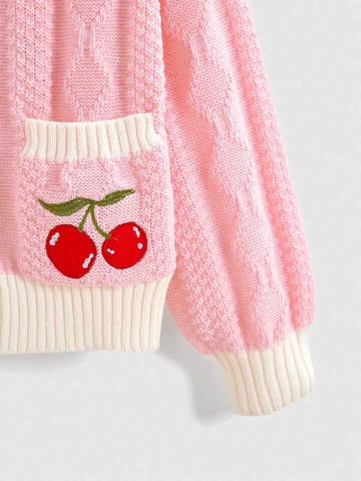Kawaii Gilet en tricot à manches ballon avec poche contrastante, broderie de cerise mignonne, pour femmes