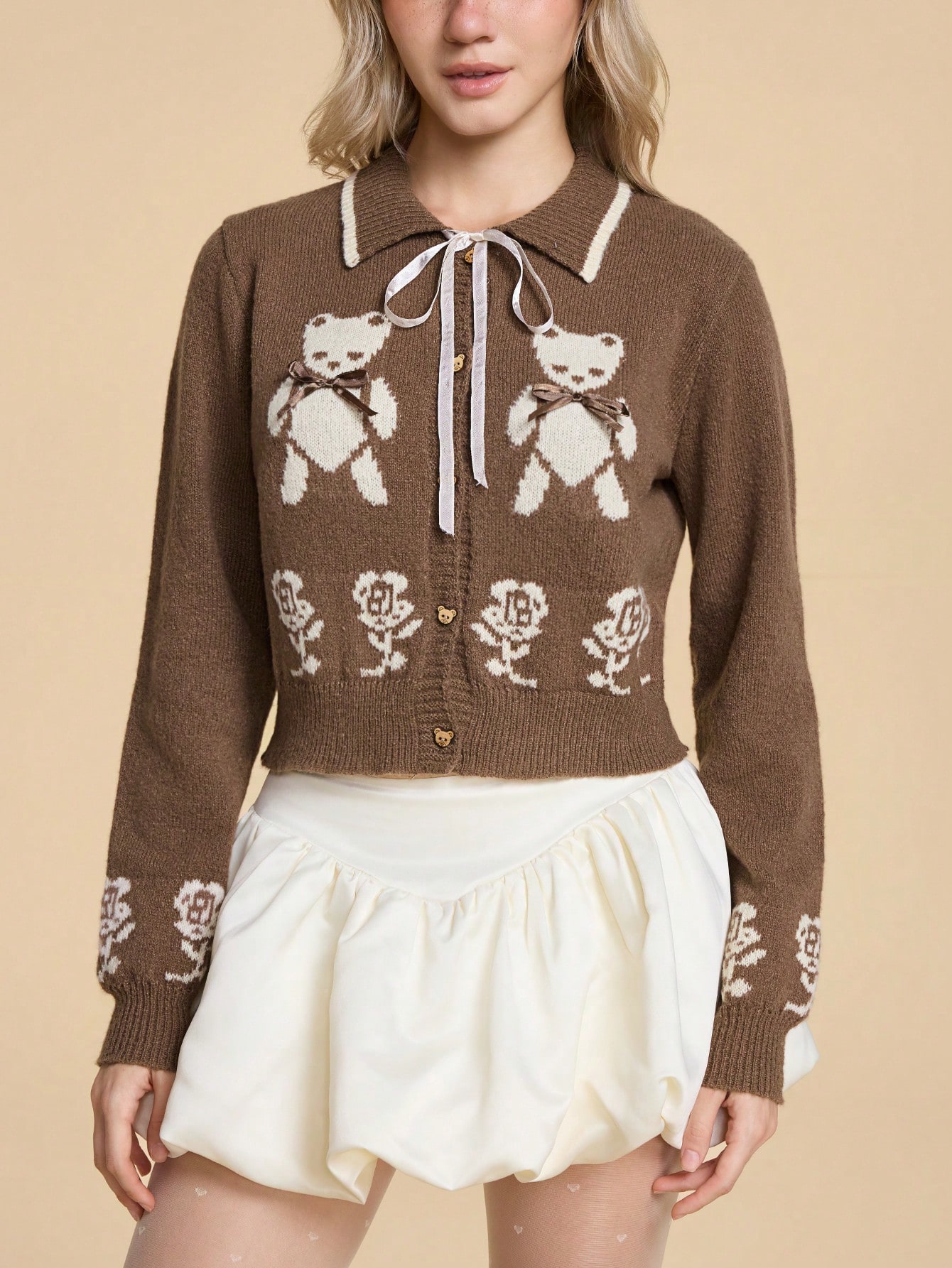 Kawaii Cardigan fin avec col claudine mignon, ruban, petit ourson et rose pour femmes