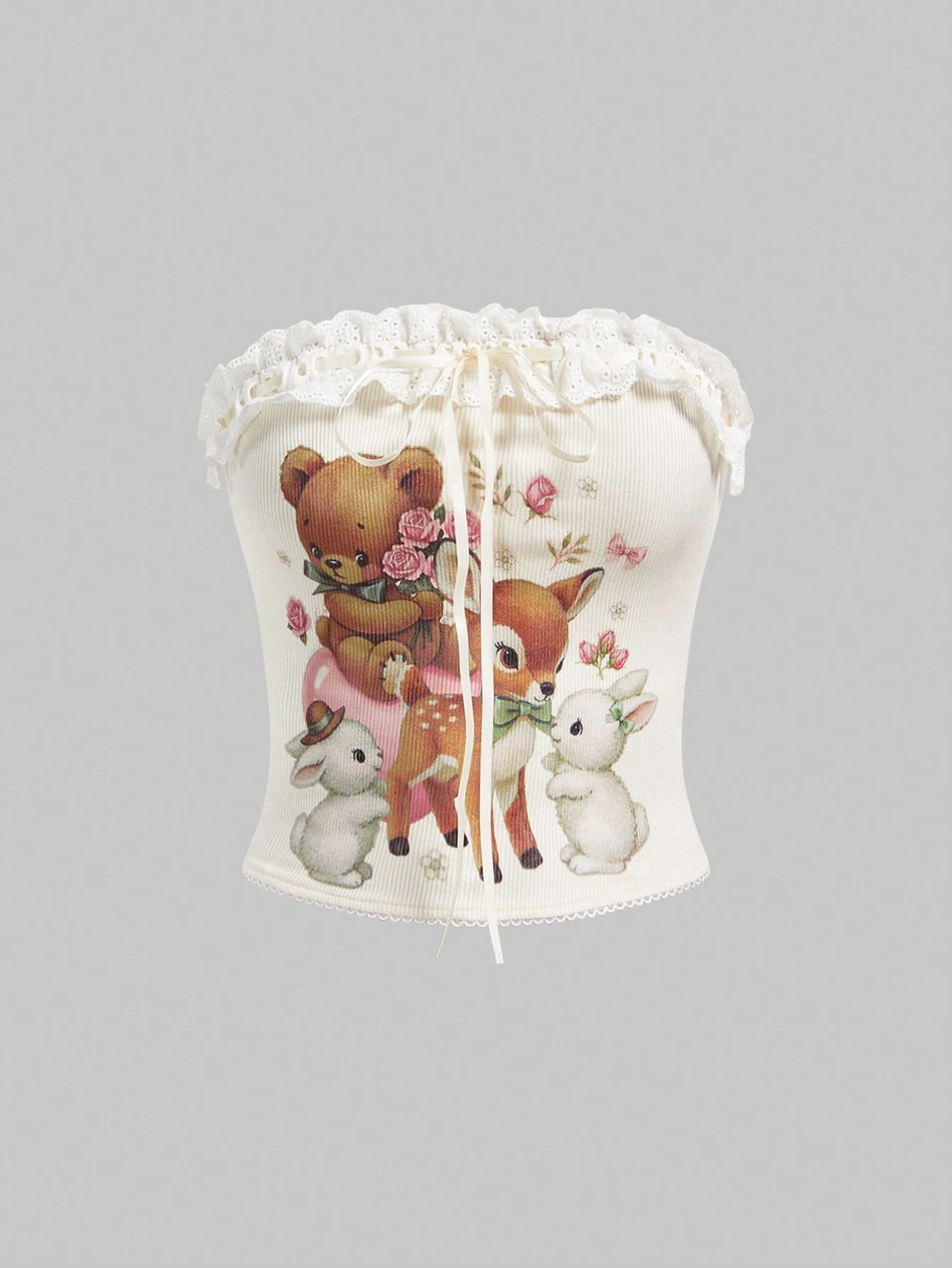 Kawaii Top bandeau à nœud avec dentelle et imprimé mignon rétro d'ours, de poney et de lapin pour femmes