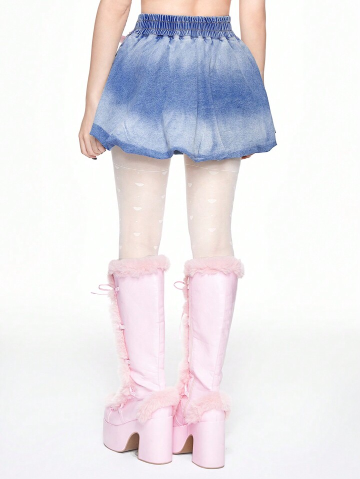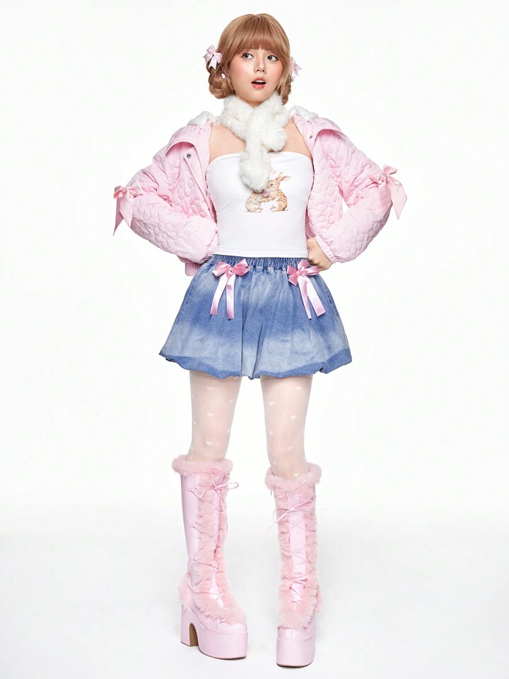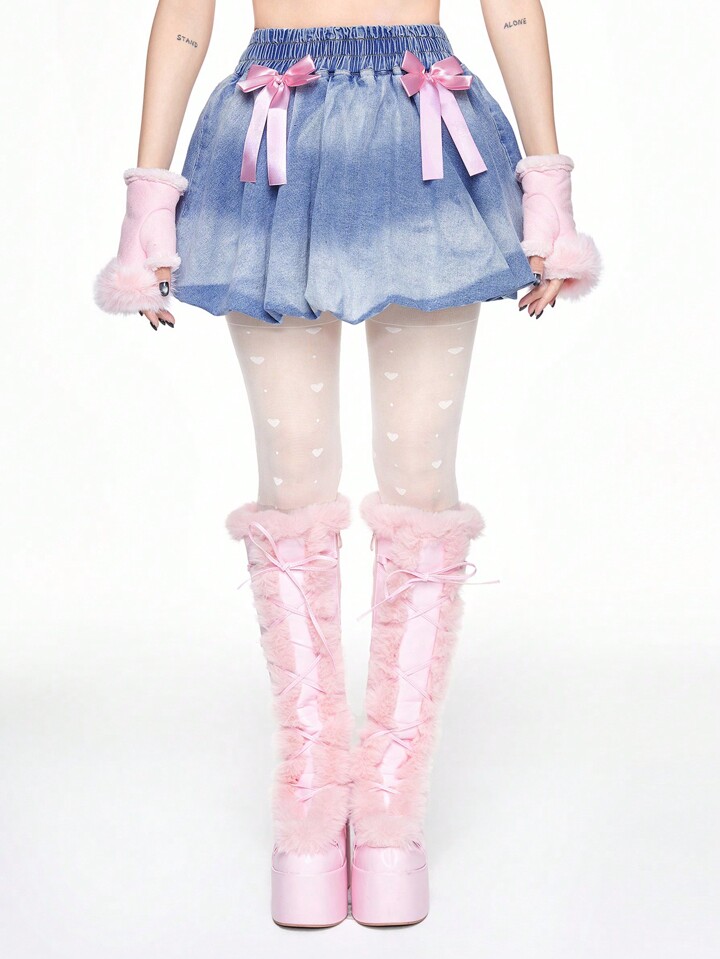 Kawaii Jupe en jean évasée avec nœud ruban adorable comme ornement pour femmes