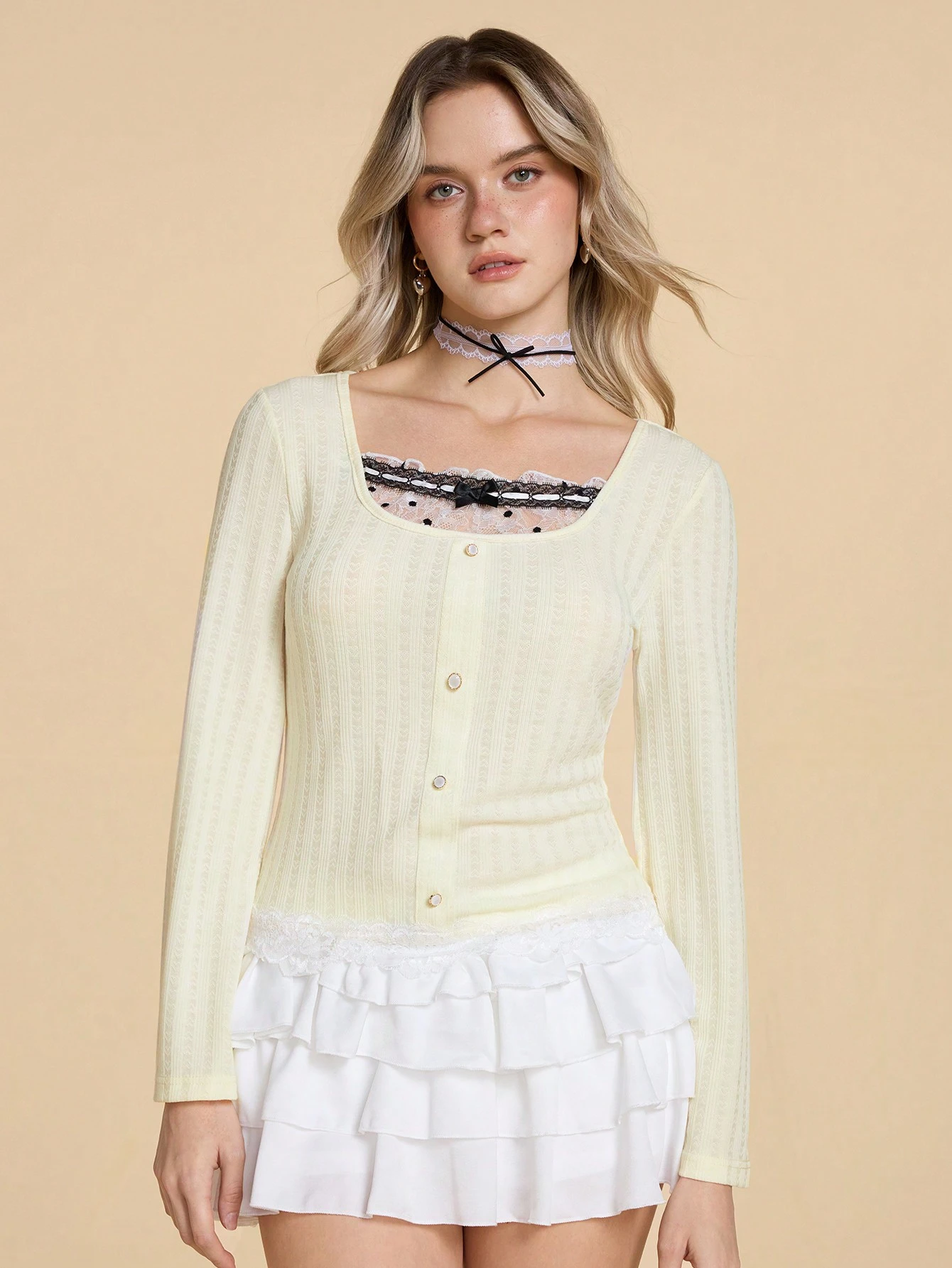 Kawaii T-shirt casual à manches longues avec patchs en dentelle et décoration nœud pour femmes