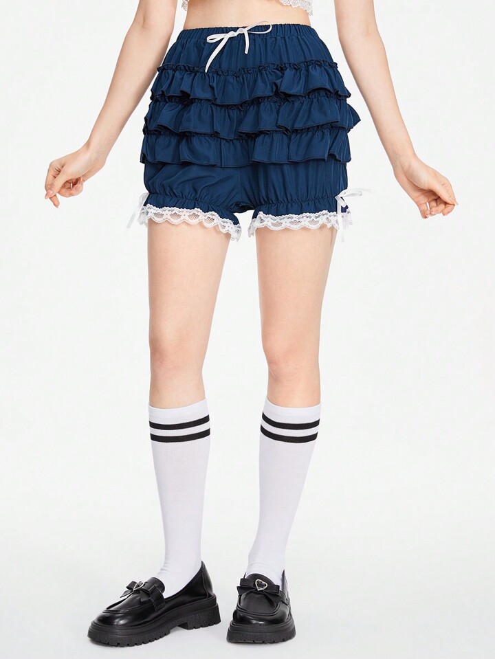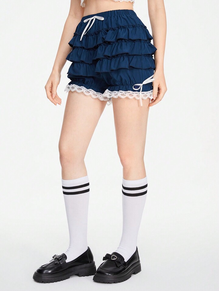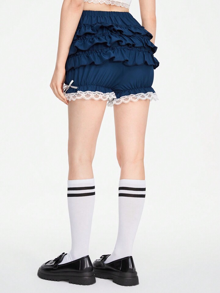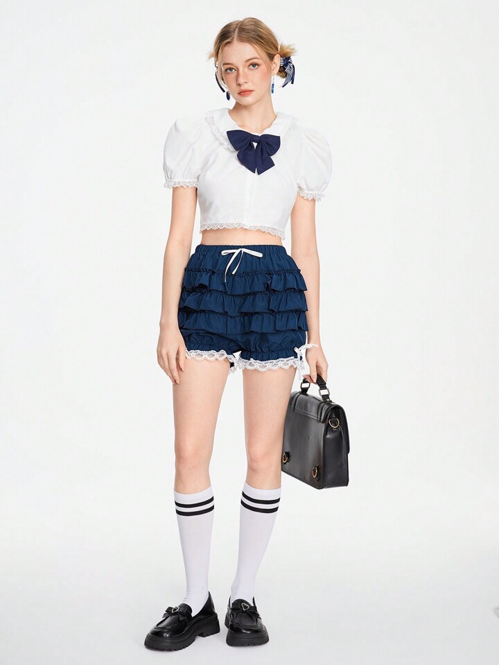 Kawaii Pantalon lanterne pour femme, short collège de style marin avec couleur contrastée et bordure en dentelle, mignon pour l'école