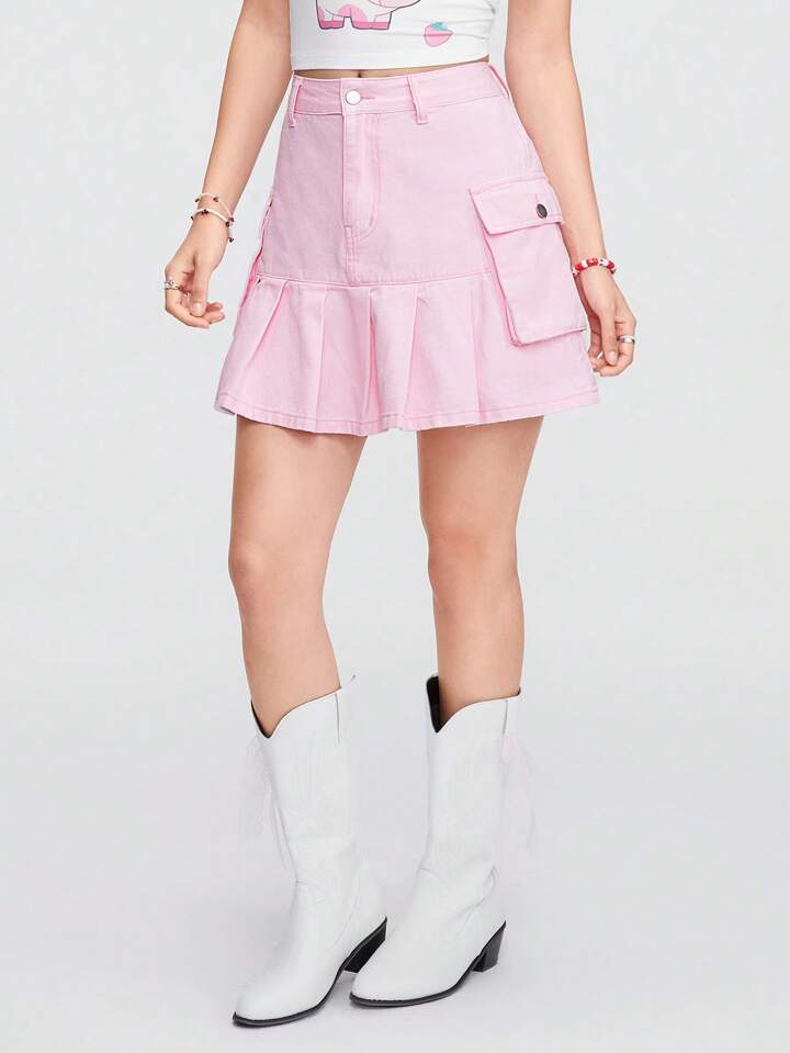 Kawaii Jupe En Denim Plissée Rose Macaron À Poches Utilitaires Pour Femmes