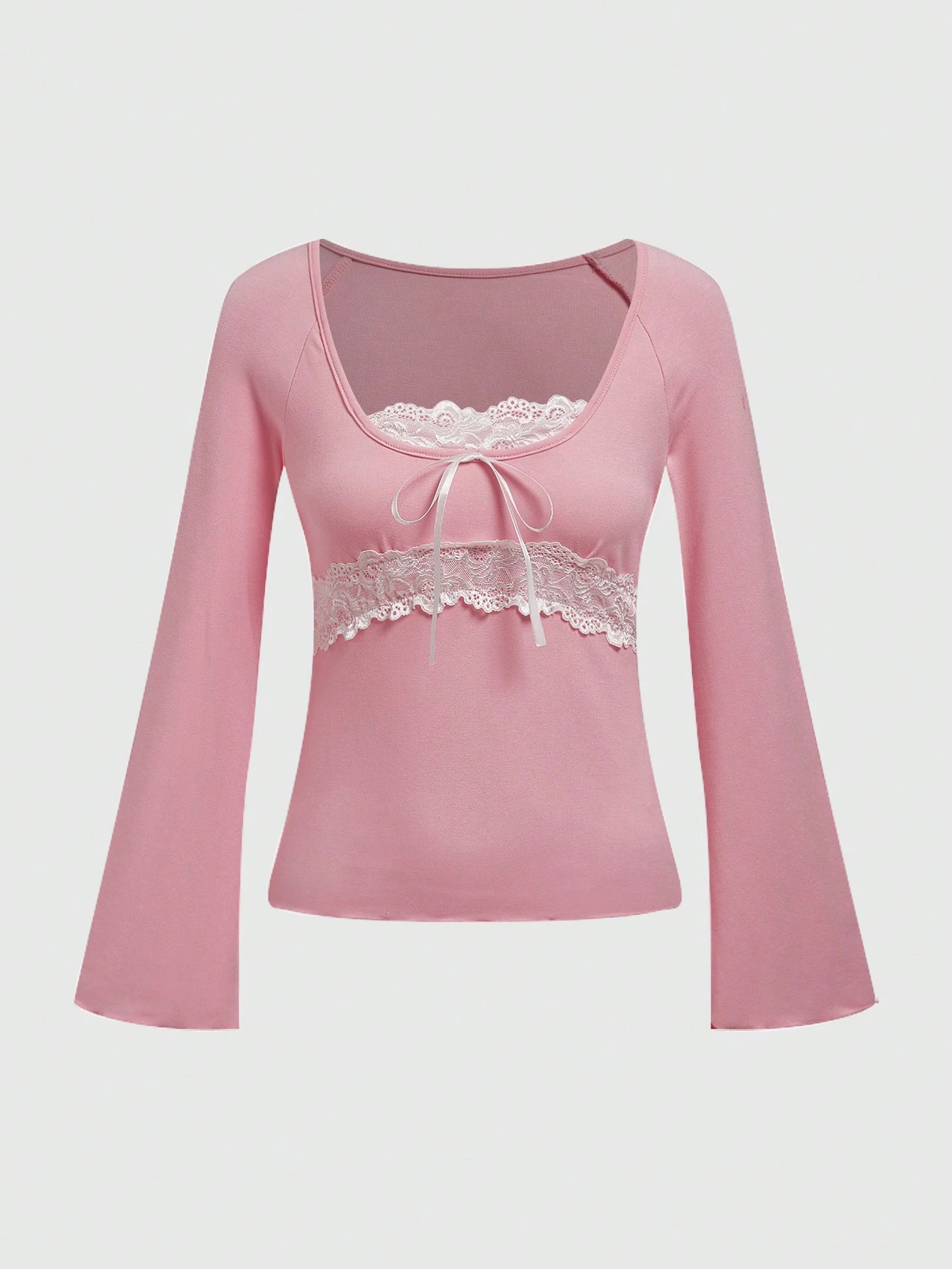 Kawaii T-shirt À Manches Évasées En Dentelle Pour Femmes
