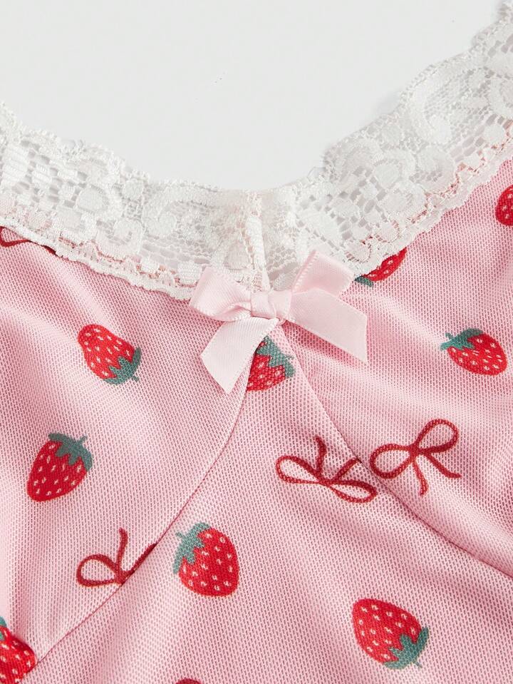 Kawaii Débardeur à imprimé fraise et nœud papillon avec dentelle contrastée pour femme, école
