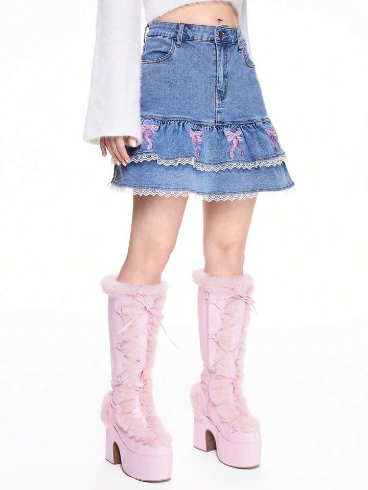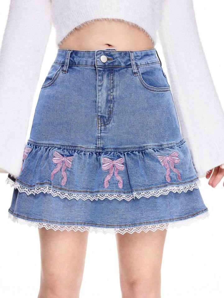 Kawaii Jupe mini trapèze en jean pour femme avec volants, patchwork et broderie papillon au style doux