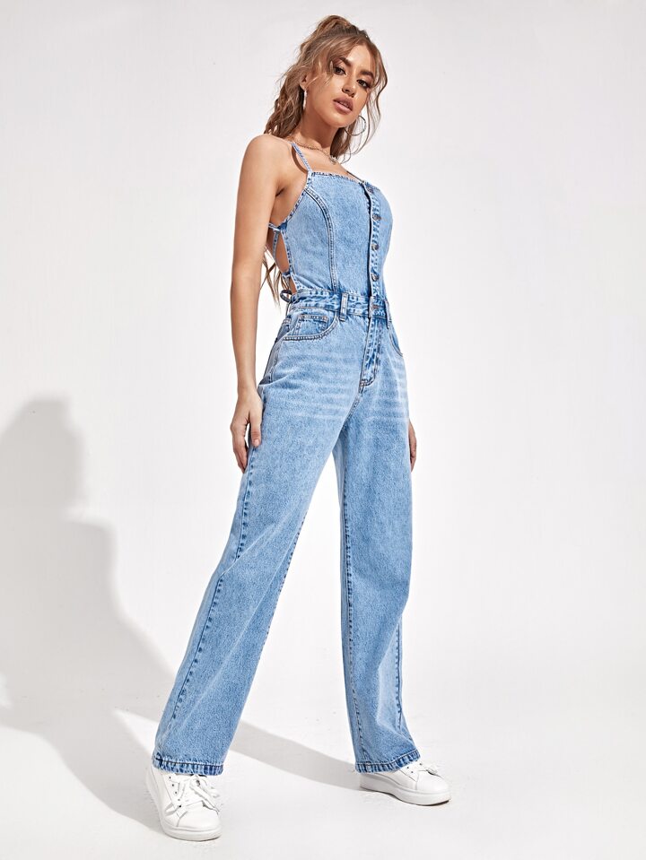 Salopette en jean dos-nu à lacets à bouton
