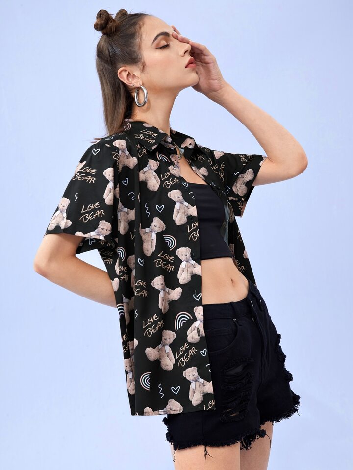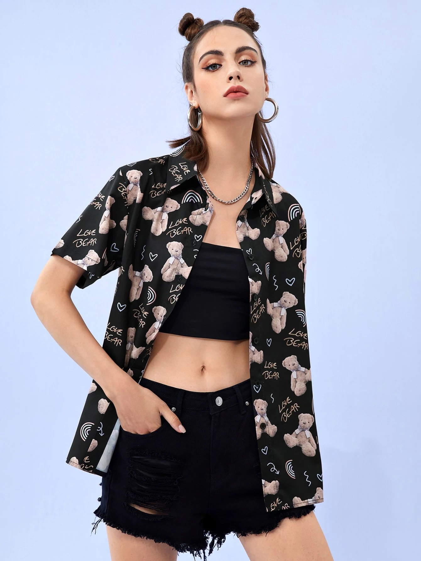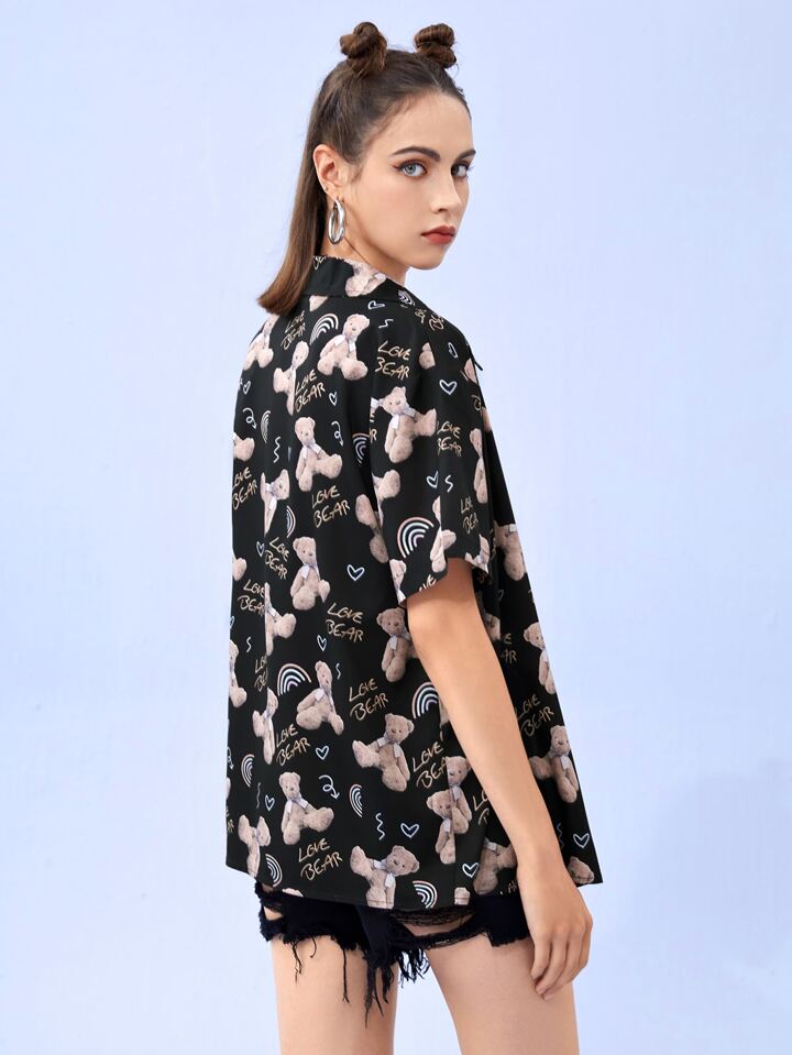 Chemisier lettre à imprimé ours dessin animé à bouton