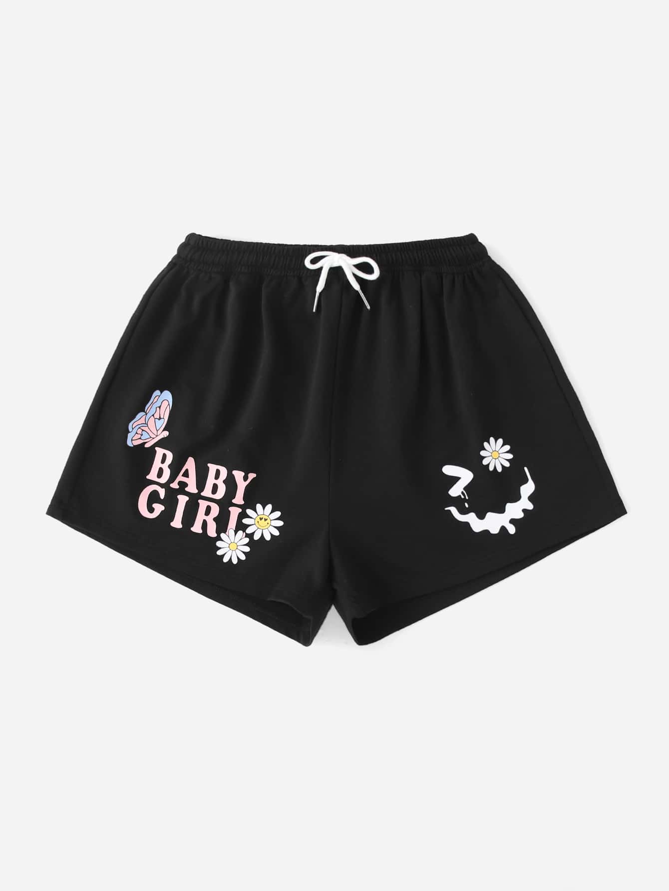 Short de sport lettre fleuri & papillon à cordon