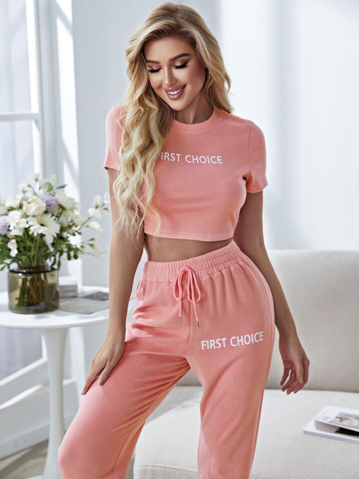 Ensemble de pyjama t-shirt court à lettres & Pantalon à nœud