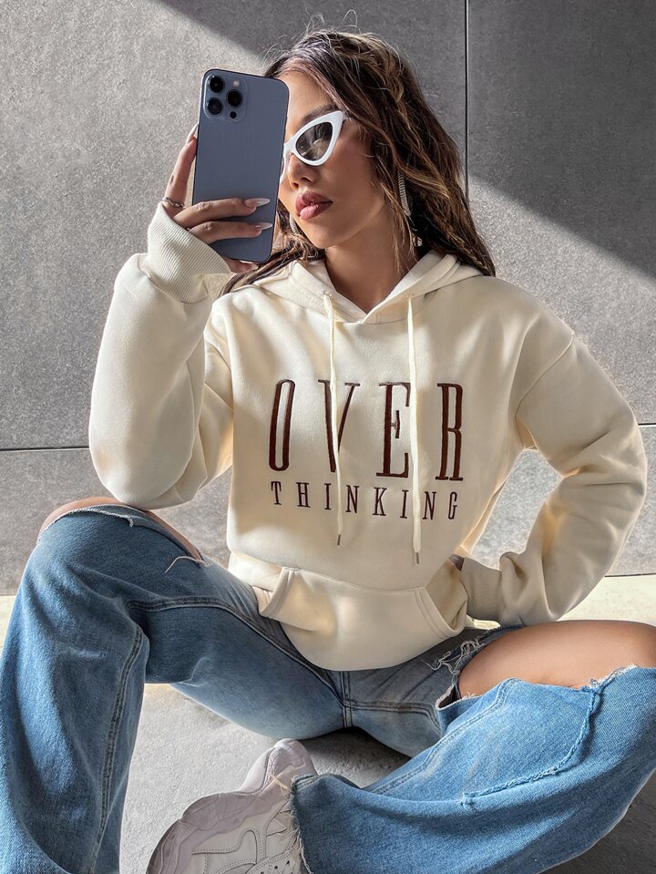 sweat-shirt à capuche doublé thermique avec cordon de serrage à l'épaule tombante avec motif lettres, Top à manches longues