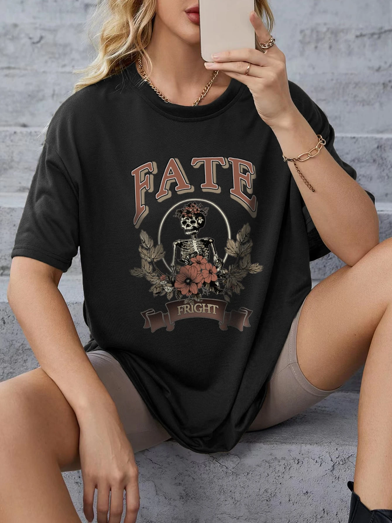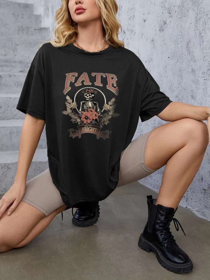 T-shirt lettre tête de mort & fleuri