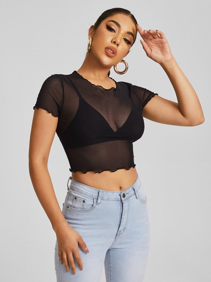 Haut court transparent en maille côtelée à la laitue sans soutien-gorge, haut de sortie