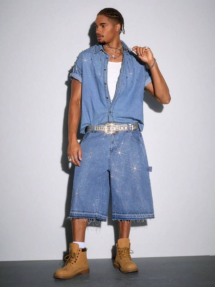 Street Life Chemise en jean décontractée à simple boutonnage ornée de cristaux pour hommes en été